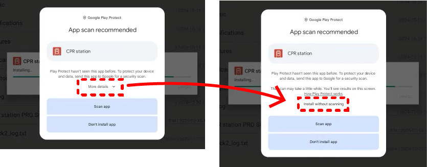 ③ 안드로이드 보안 정책에 따라 앱 스캔 메시지가 표시될 수 있습니다. More Detail → Install without scanning을 선택해주세요.