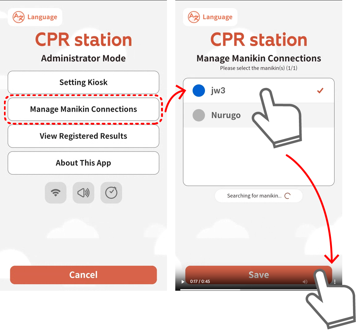 ④ 연결할 마네킹을 선택하고 ‘저장’버튼을 누르면 키오스크가 앞으로 자동으로 이 마네킹을 연결합니다.