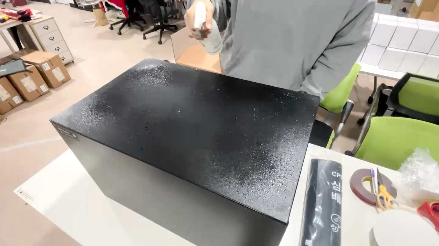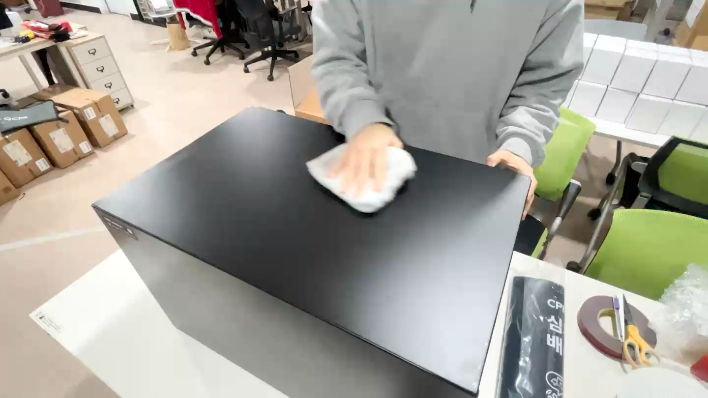 - 옆에서 보았을때 기포가 없는지 확인하고, 바깥으로 밀어내 없애줍니다. 더이상 기포가 없다면 행주로 물기를 닦습니다.